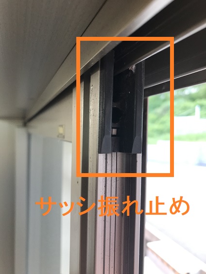 サッシの振れ止めとは、サッシの上部に取り付けられているプラスチック製のカバーの様なものです。サッシレールに建て込まれており、この振れ止めがあるお陰で窓サッシのガタツキを軽減する事ができます。長年使用したサッシでは経年劣化で振れ止めが破損して滑落している事もあり、それが原因で、サッシレールに対して窓サッシの建て込み部分に遊びが多く発生してしまいガタツキが生じている事があります。振れ止めを交換すれば良いのですが、正規品を探す作業が意外と難しく、サッシ屋に依頼した方が良い案件です。