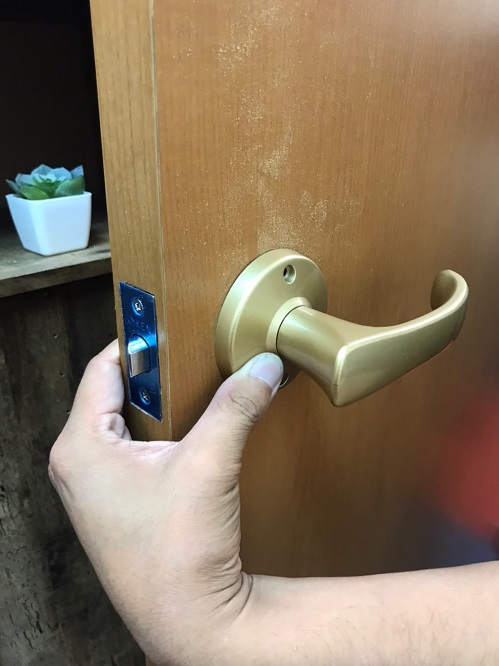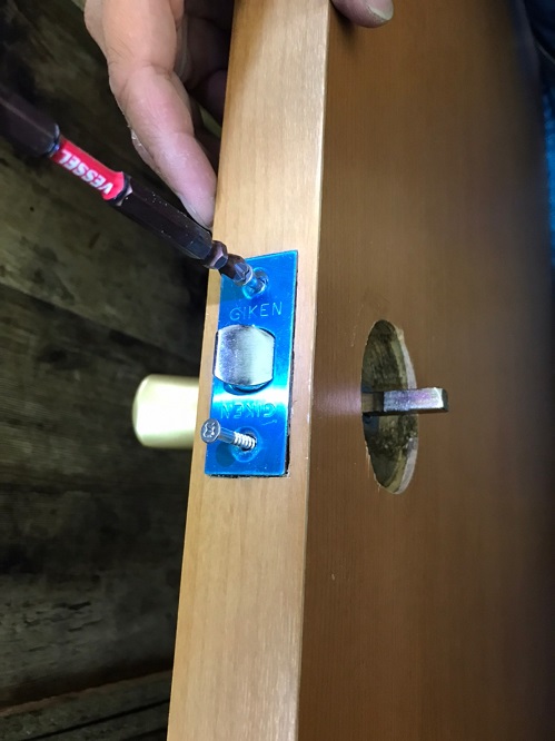 はい。ということで早速作業写真をご確認下さい。そもそもラッチが固着してしまい不具合を起こしているドアノブです。取替えるべく合いそうなドアノブを探してみたものの中々ピッタリの商品がなく、やむを得ず建具側を加工して新しいドアノブに取替えした現場です。