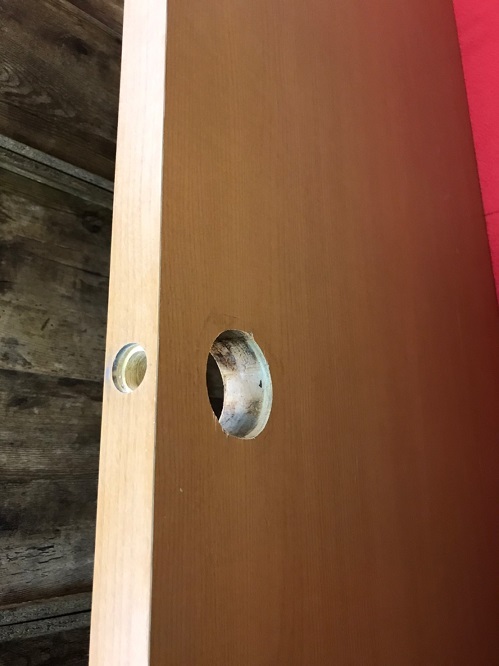 電動工具で”ウィーン、ウィーン”と何度か刃を通して一回り、二回り穴を広げます。次いで、フロントが収まる様に、穴の周りを彫刻刀で彫り込んで行きます。