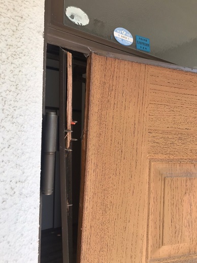 玄関ドアが壊れたので至急対応して欲しいとご相談を受けました。ドアを閉めることもままならない状態で防犯上も良くないと仰っています。どの様な状態なので当日お伺いし確認しましたが、玄関ドア交換が推奨される状態で修理ではちょっと直りそうもありません。ドア本体の丁番部分が割れてドアが斜めを向いている状態です。