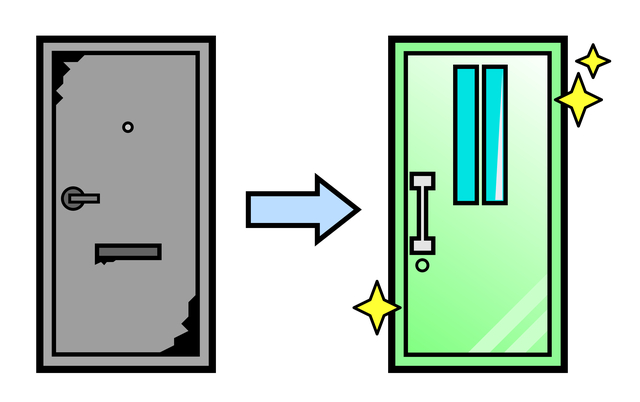 一方、安価に抑えようとすれば、フラッシュドアなど比較的シンプルなドアへ取替える方法がおすすめです。新築用のドアを見繕う事でお客様と予算を合わせて行きます。