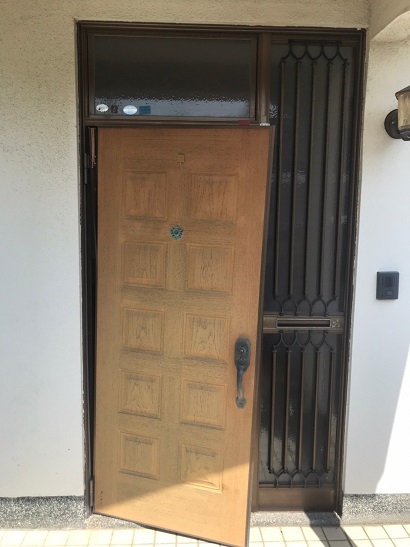 状況を拝見するに「お客様、これは修理ではちょっと難しいと思いますので、玄関ドアの交換をされた方が良いと思いますよ。」とお伝えしました。予算的に厳しいので安く済む方向で解決して欲しいとご相談がありました。玄関ドア交換の費用は、言ってしまえば交換する商品代金に大きく影響します。どっしりと高級感のある玄関ドアや、換気の出来る玄関ドア、防犯性と利便性を高めたタッチキー付きの玄関ドアなど、予算次第では最新型の商品と交換する事も可能です。